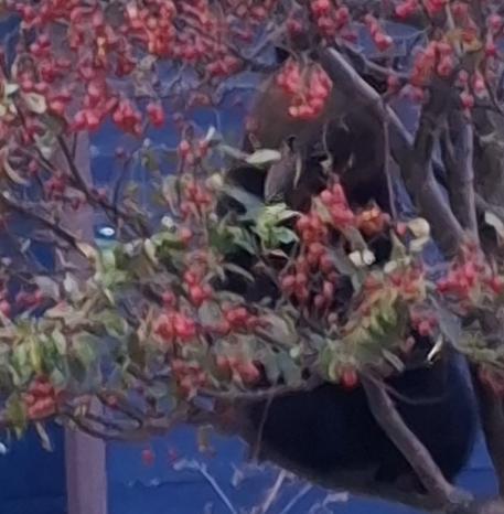 26日午後、道道228号線の街路樹にクマがよじ登り、ヒメリンゴの実を食べていました。