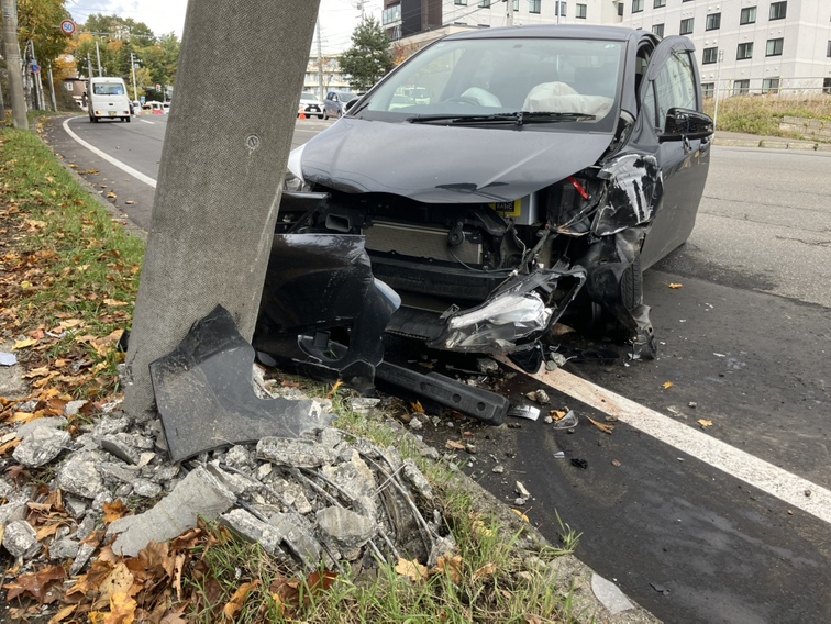 北海道札幌市の交通量の多い交差点で10月29日朝、信号機の支柱に乗用車が突っ込む事故がありました。