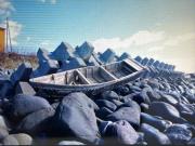 衝突したイカ釣り漁船(拡大:損傷した船首部分)