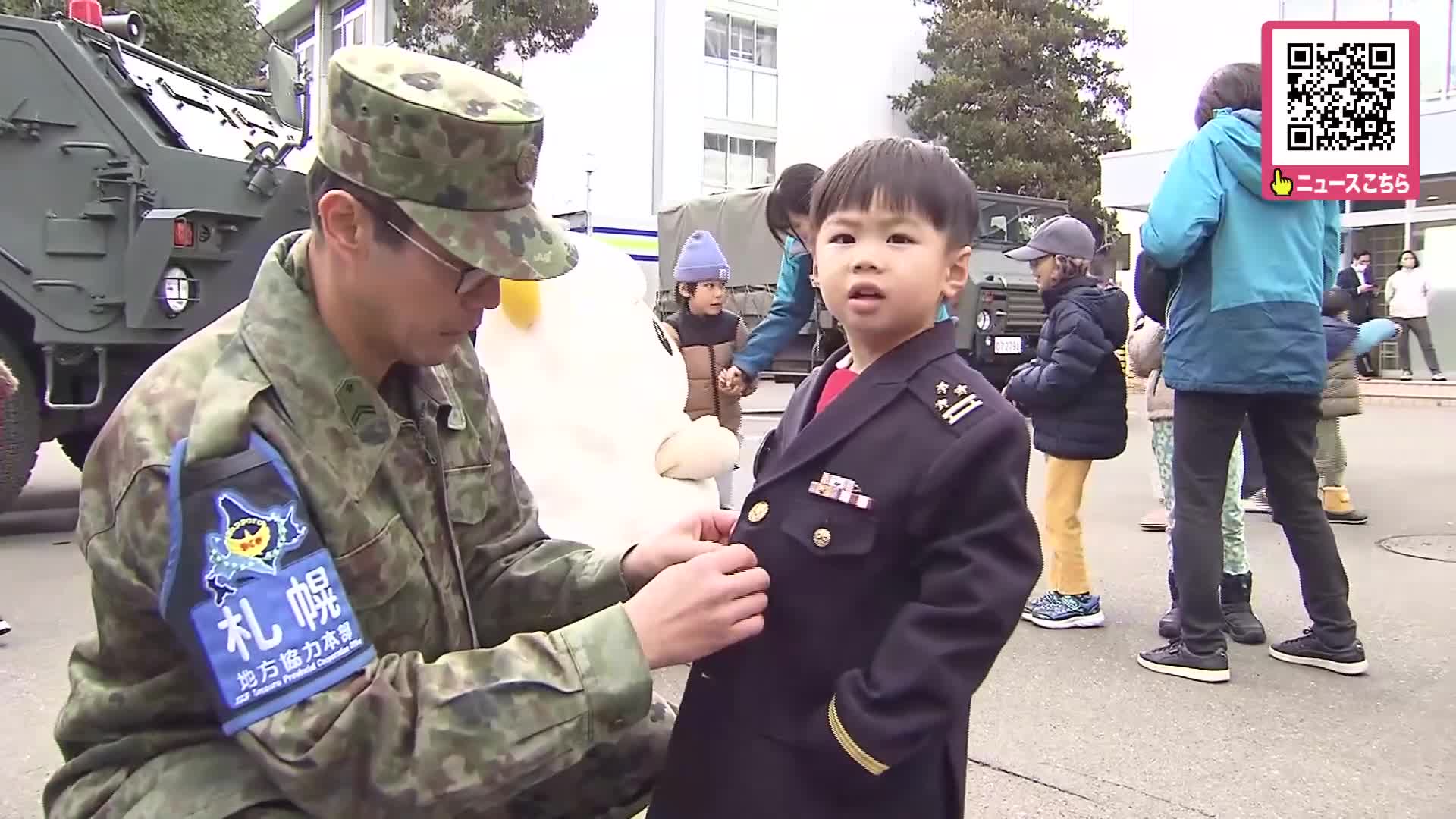 はしご車のかごに乗れる体験のほか、自衛隊車両の前で記念写真を撮れるコーナーも設けられました。