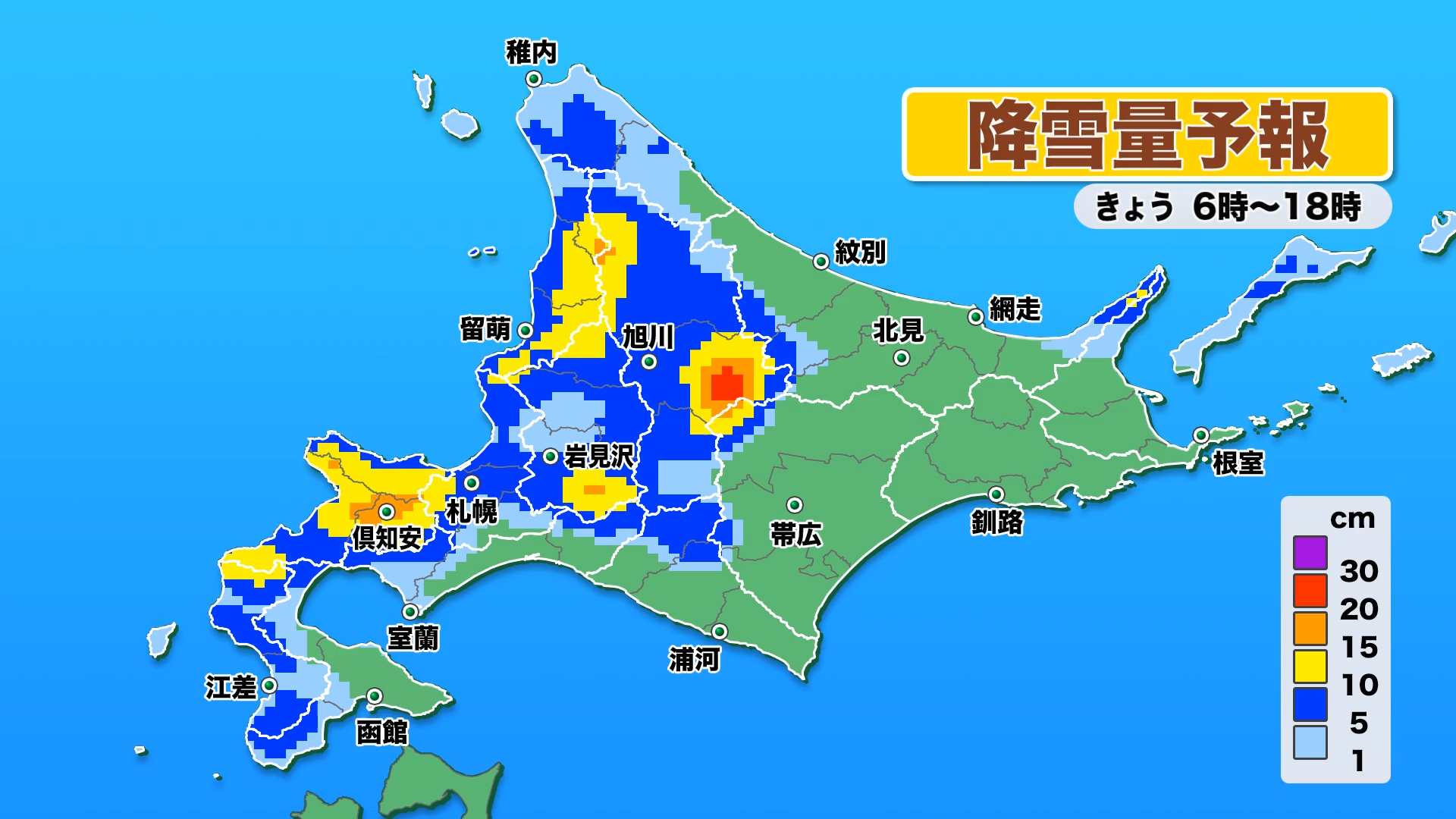 北海道はきょういっぱい冬型の気圧配置が続く予想で、あす19日午前6時までの24時間に予想される雪の量は、日本海側の多い所で30センチとなっています。