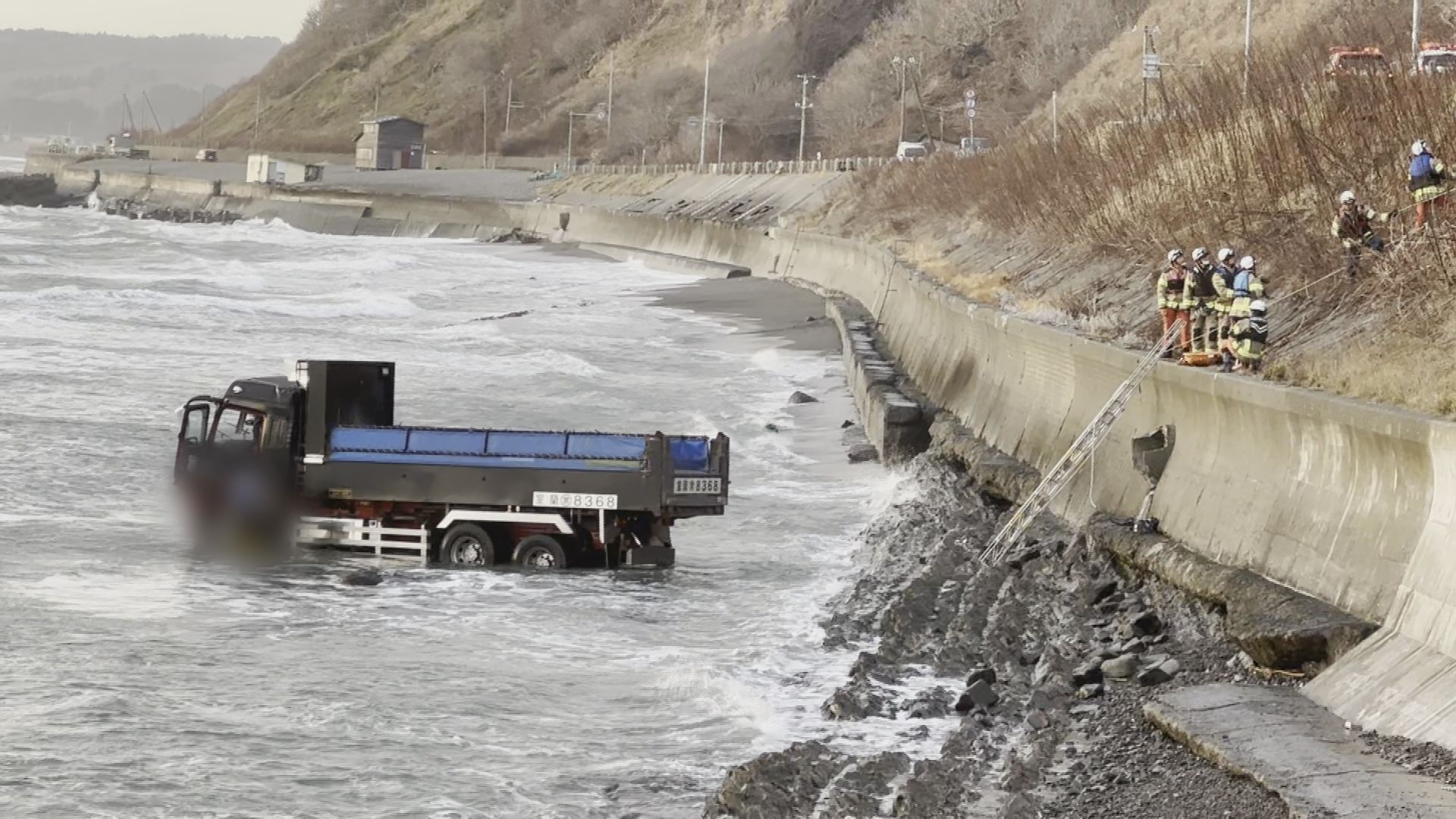 「ダンプが海へ落ちていった」走行中に何らかの原因で路外へ逸脱ーそのまま白波立つ海へ落ちたか…タイヤまで浸かる_60代男性運転手ケガ〈北海道新ひだか町〉