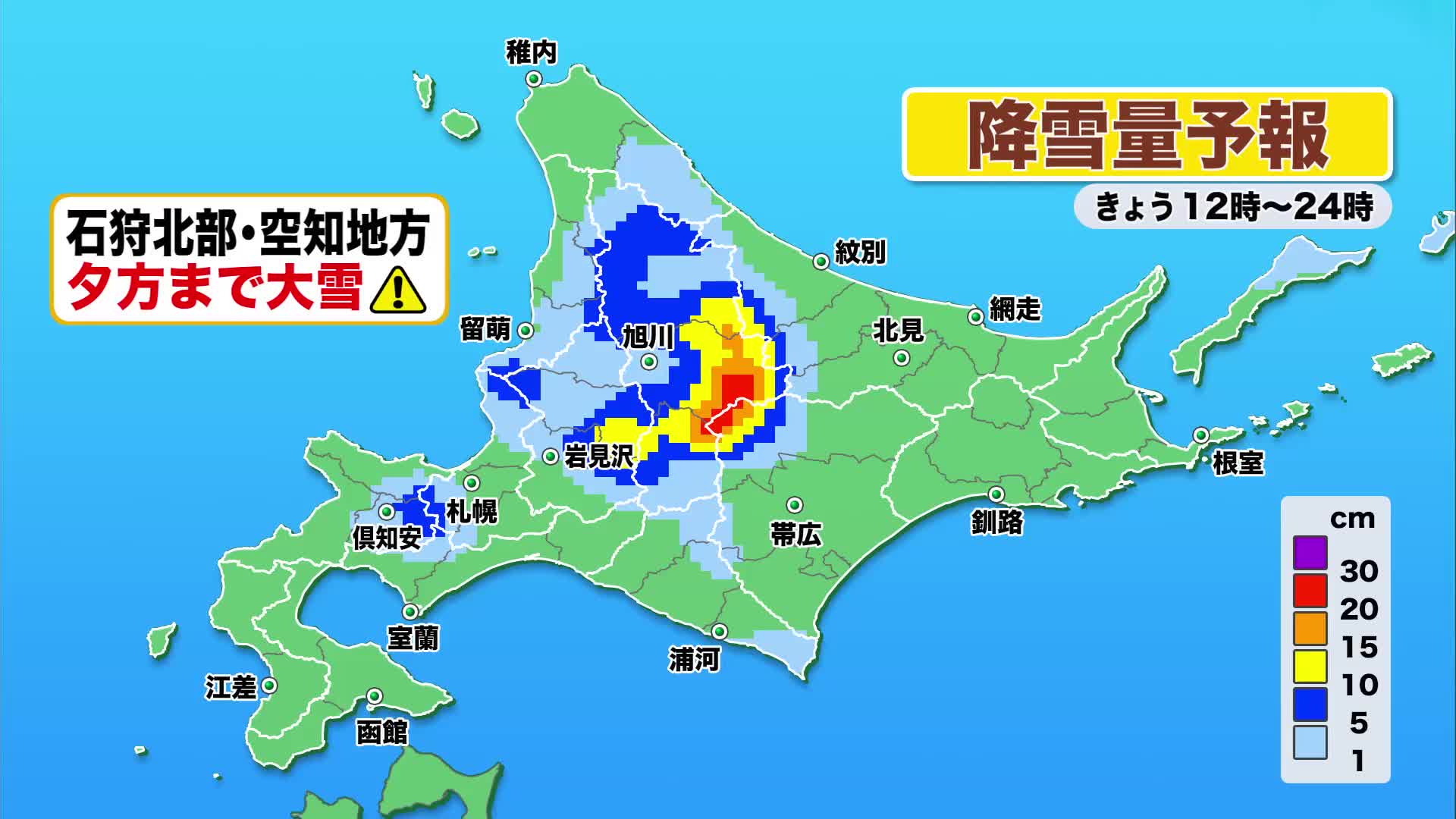 石狩市から美唄市付近は夕方まで、局地的に強い雪が降りそうです。
