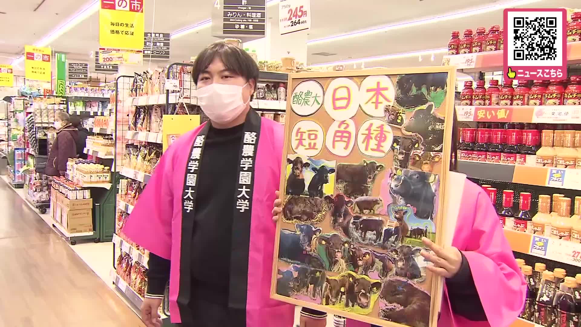 「酪農学園大産のお肉、販売しています。いかがですか」(学生)