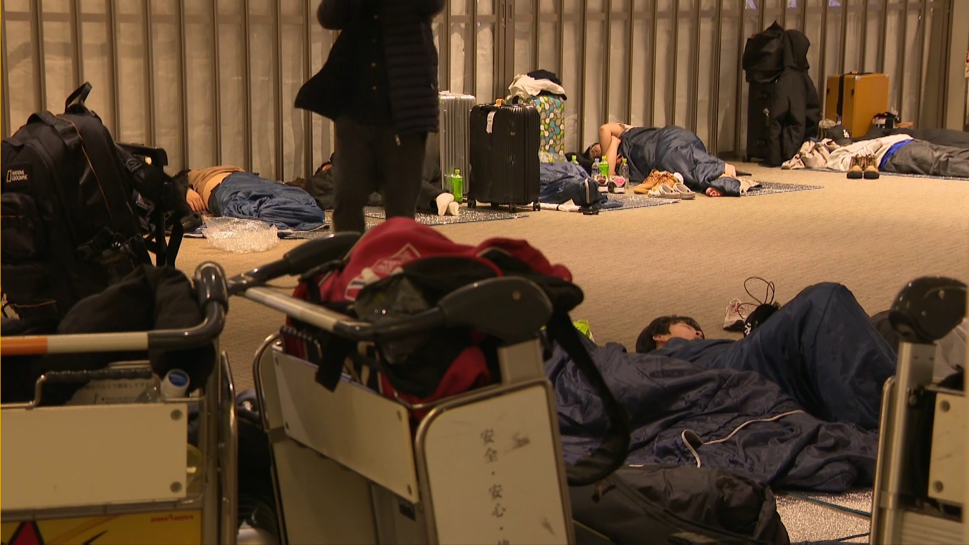 羽田に向かう予定だった利用客は「予定数いっぱいで、もう入れなくて、毛布を配っていて、地べたで寝るという形になりました」と振り返りました。乗る予定の便が2つ欠航となり、翌日の朝の便でようやく振り替えができたということです。