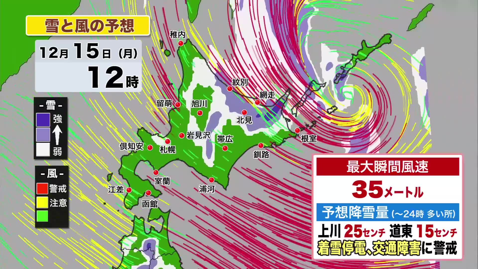 【北海道の天気 15日(月)】低気圧が急発達…12月としては記録的な大雪・暴風!午後はオホーツク海側を中心に猛吹雪に警戒を!
