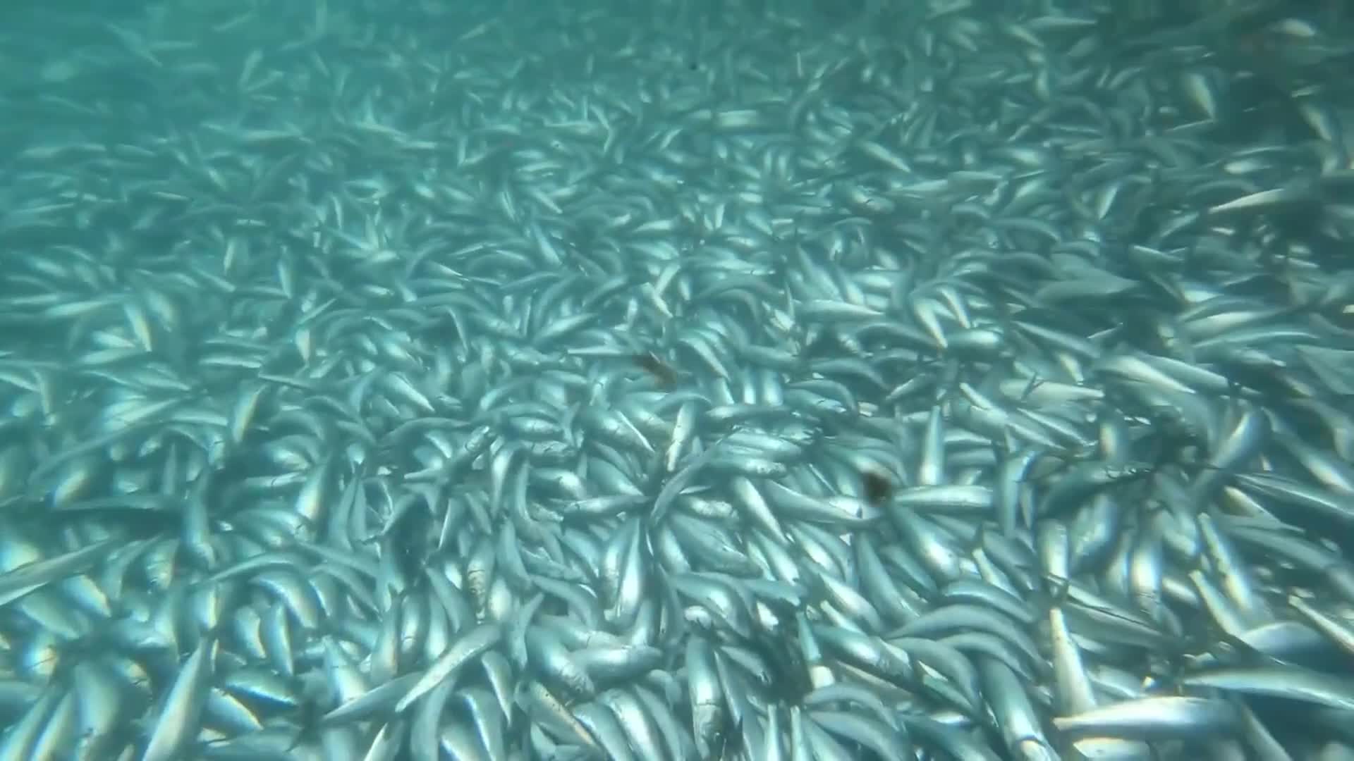 この港ではイワシの大群が押し寄せ、港内の一角にはイワシの死骸が大量に沈んでいました。