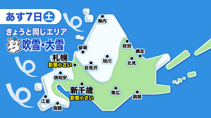 土曜日は低気圧の影響で道内全域で雪や雨が降り、特に道北や道東の内陸部では積雪が増える可能性があります。