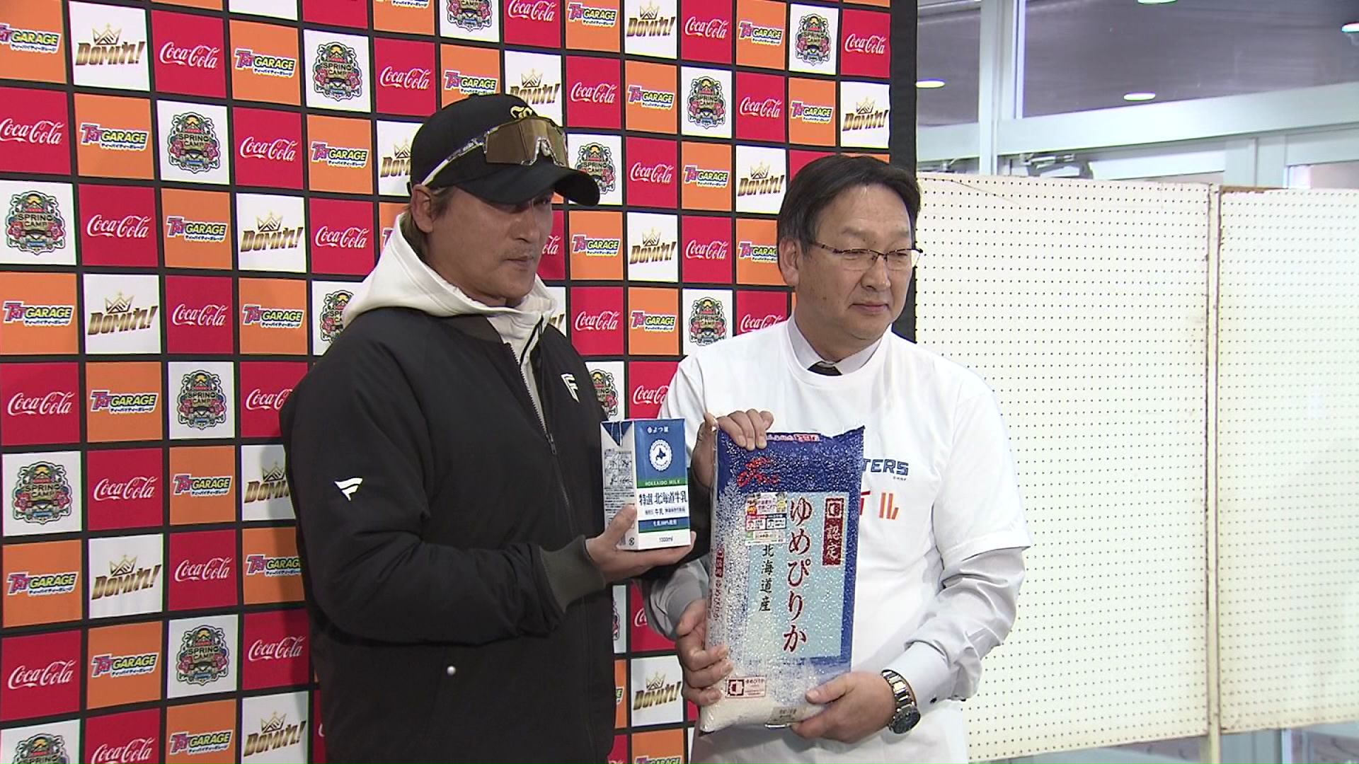 第2クール最終日の2月8日、スポンサーとして球団を応援しているホクレンの徳田善一副会長から新庄監督に北海道米の「ゆめぴりか」150キロと北海道産牛乳96リットルが贈呈されました。