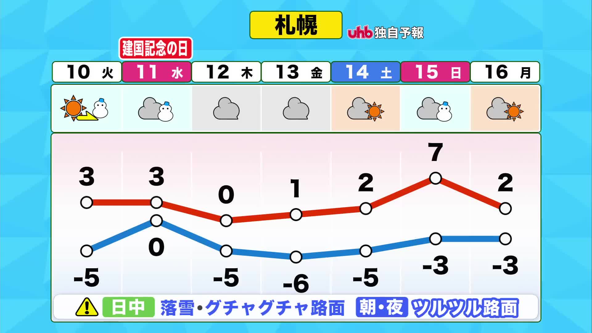 札幌は-2℃、道北は-5℃前後の所が多いでしょう。