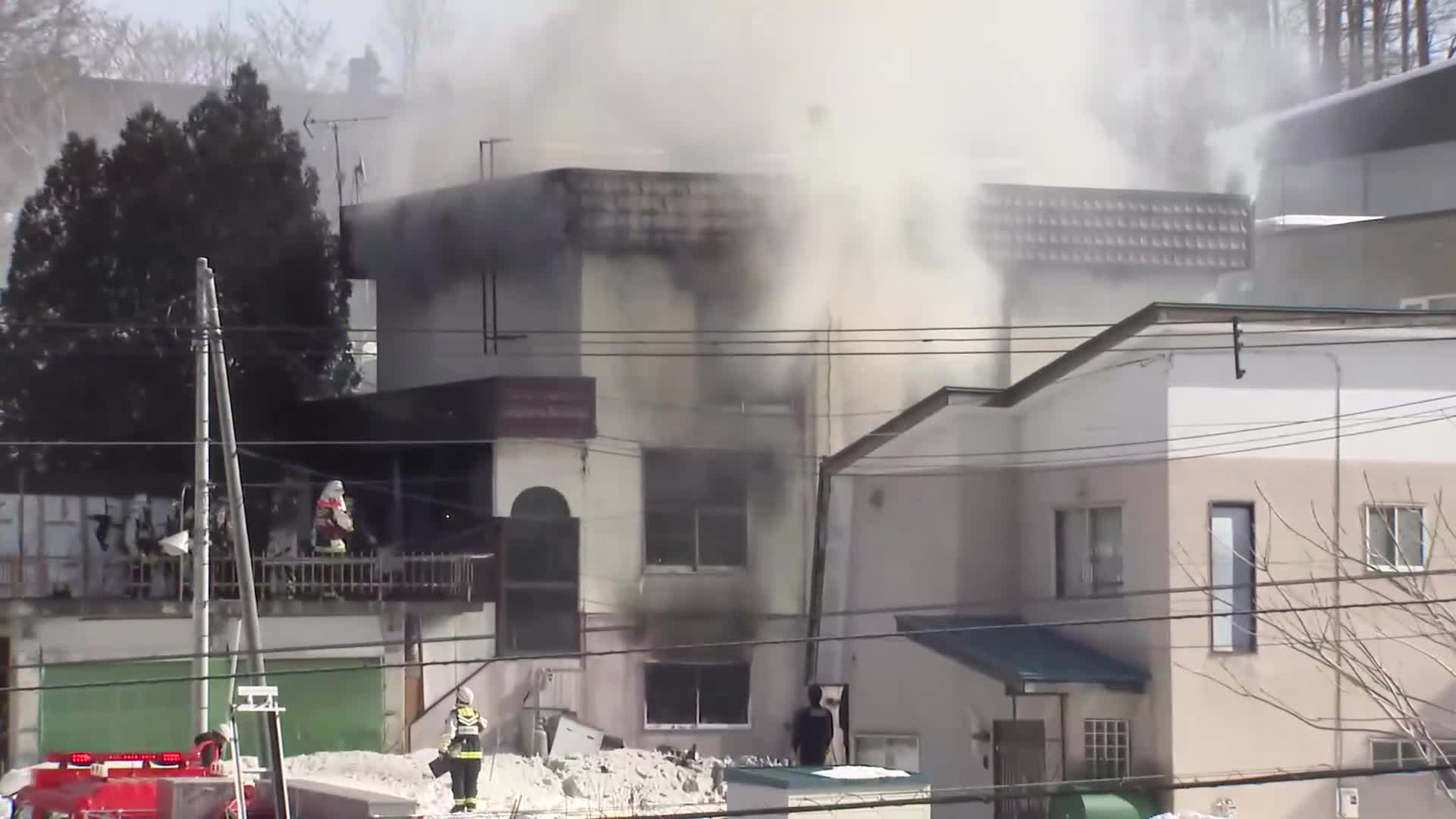 「火事の現場です。 あたりには焦げ臭い匂いが立ち込め、 消防が中に人がいないか確認を続けています」(吉村直人 記者)