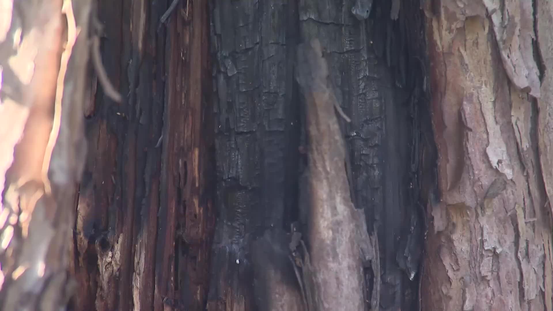 真っ黒に焦げたマツの木。広い範囲にわたって焼けています。