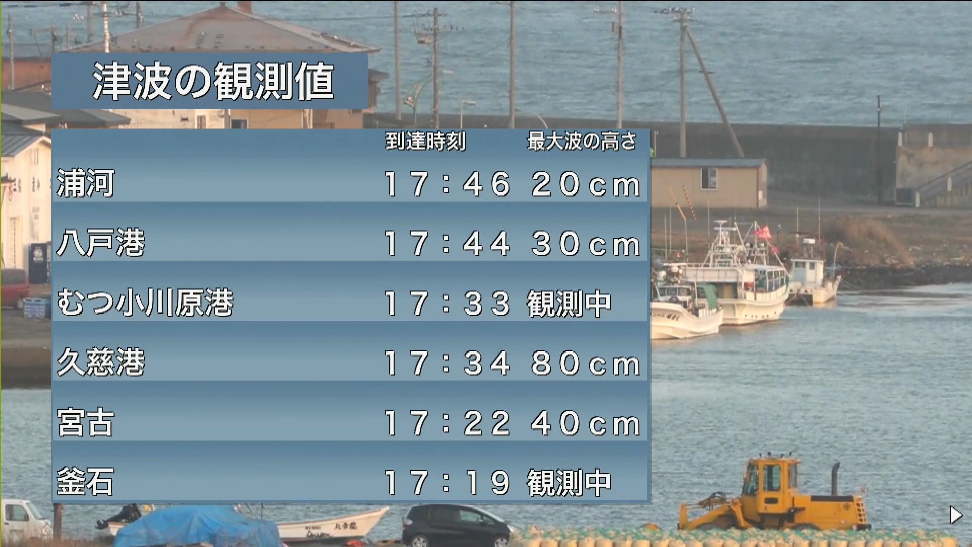 浦河町では午後5時46分ごろ、最大波20センチの津波を観測しました。続いて、えりも町庶野でも津波が観測されています。
