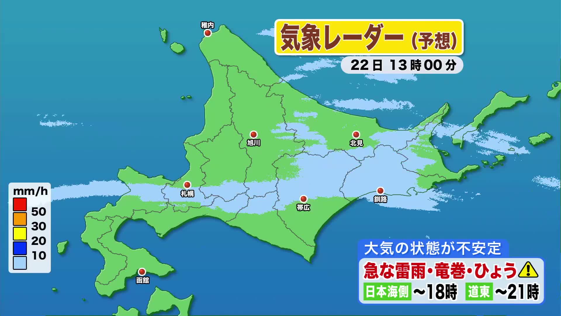 釧路の内陸から後志にかけて雨雲がかかっています。