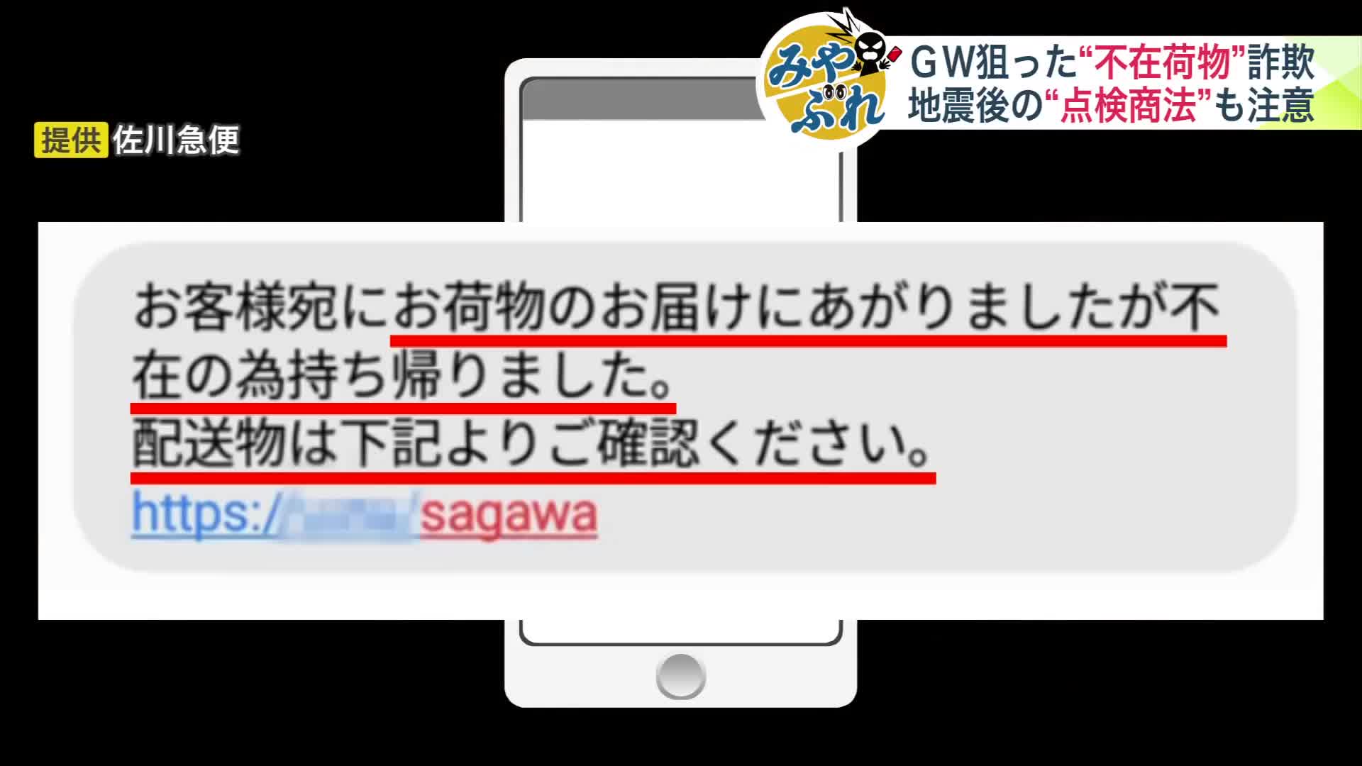 【GW狙う詐欺・悪質商法】「不在荷物を持ち帰りました」の偽メッセージでURLタップ⇒クレカ情報入力させるフィッシング詐欺_「工事をしないと危険だ」と地震のあとに来訪する「点検商法」に要注意【みやぶれ】