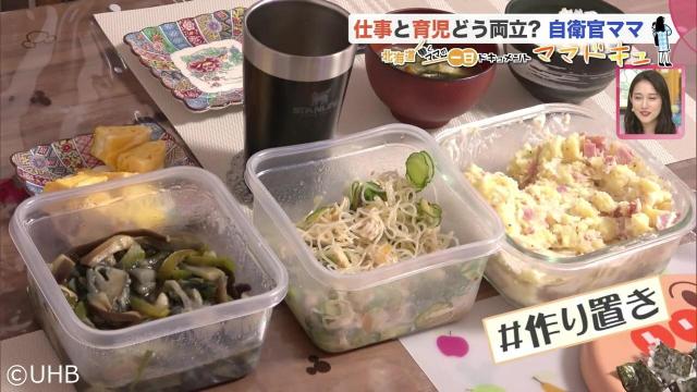 朝5時におじゃますると、もうお弁当がほとんど完成している状態。実はこれ、夜のうちに詰めているそう。朝はごはんと卵焼きだけ入れたらあっという間に完成。朝食も味噌汁だけ作ったら、あとは作り置きのおかずを並べます。