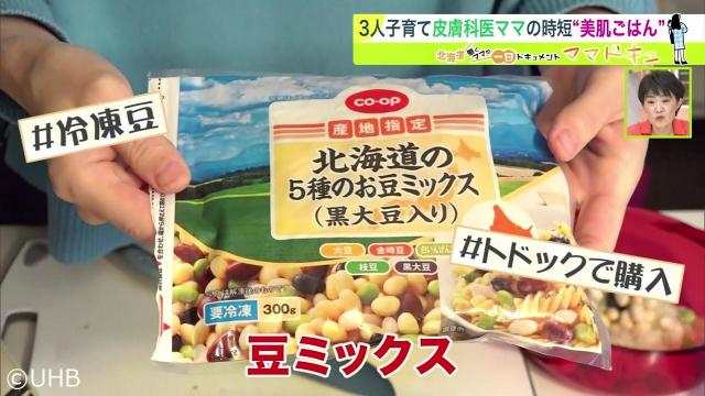 美肌作りのために、毎食欠かさないという栄養素が“タンパク質”なんだそうで、手軽に摂取できる冷凍の「CO・OPお豆ミックス」をサラダに入れて時短していました。