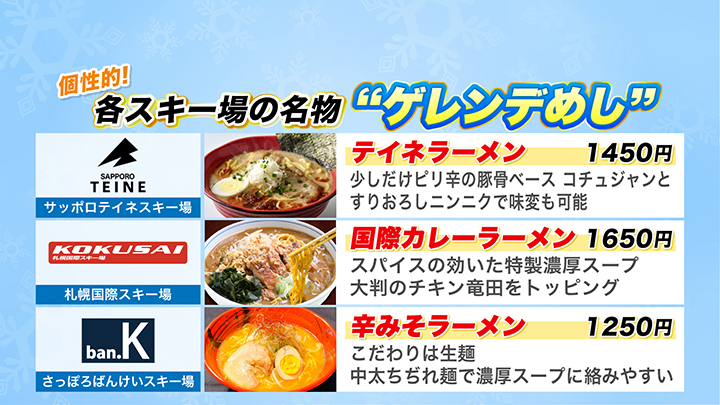 サッポロテイネスキー場はピリ辛豚骨ベースの「テイネラーメン 1450円」、札幌国際スキー場はスパイスの効いた「国際カレーラーメン 1650円」、さっぽろばんけいスキー場は中太ちぢれ麺で濃厚な「辛みそラーメン 1250円」。