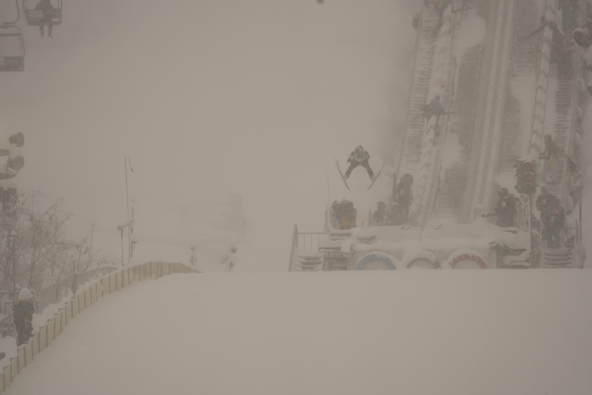 高梨選手は雪が降りしきる中、向かい風をとらえるとK点(=123m)を越える125mをマークします。昨日、今大会の目標に挙げていた“ビッグジャンプ”とはなりませんでしたが「(助走で)安定して滑って、テイクオフまでつなげられた」と五輪に向けて手応えを感じたジャンプとなりました。