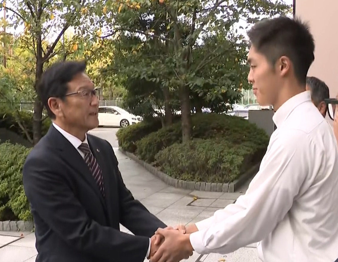10月24日に行われたプロ野球ドラフト会議で、日本ハムから1位指名された福岡大大濠高の柴田獅子(れお)投手。ファイターズの栗山英樹CBO(チーフ・ベースボール・オフィサー)が指名挨拶のため学校を訪問し、柴田投手への大きな期待を示しました。