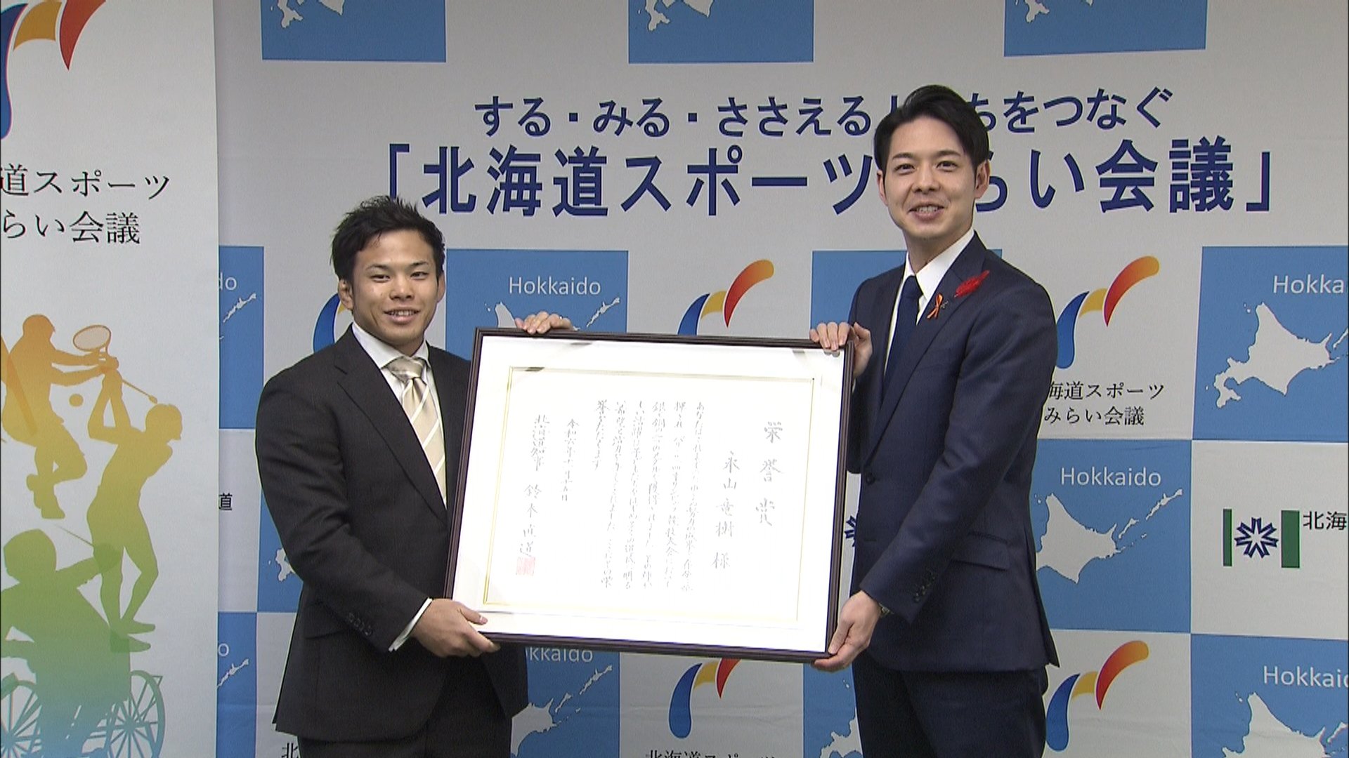 この日、北海道庁を訪れた永山選手は栄誉賞贈呈式に出席し、鈴木直道知事から道民栄誉賞を授与されました。