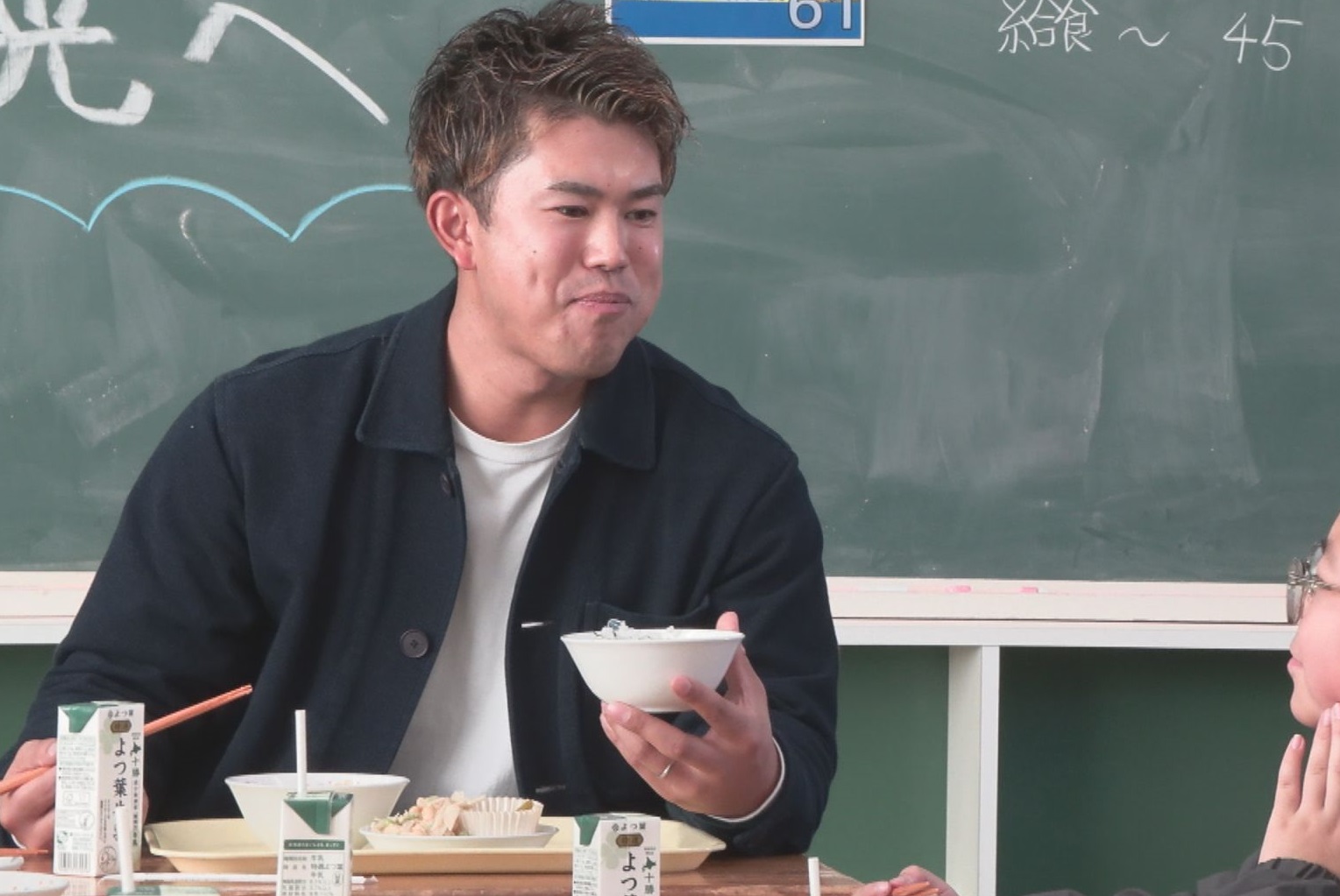 11月26日に浦幌町の小学校を訪れた今川優馬選手(27)と野村佑希選手(24)は、まず子供たちの給食に参加。