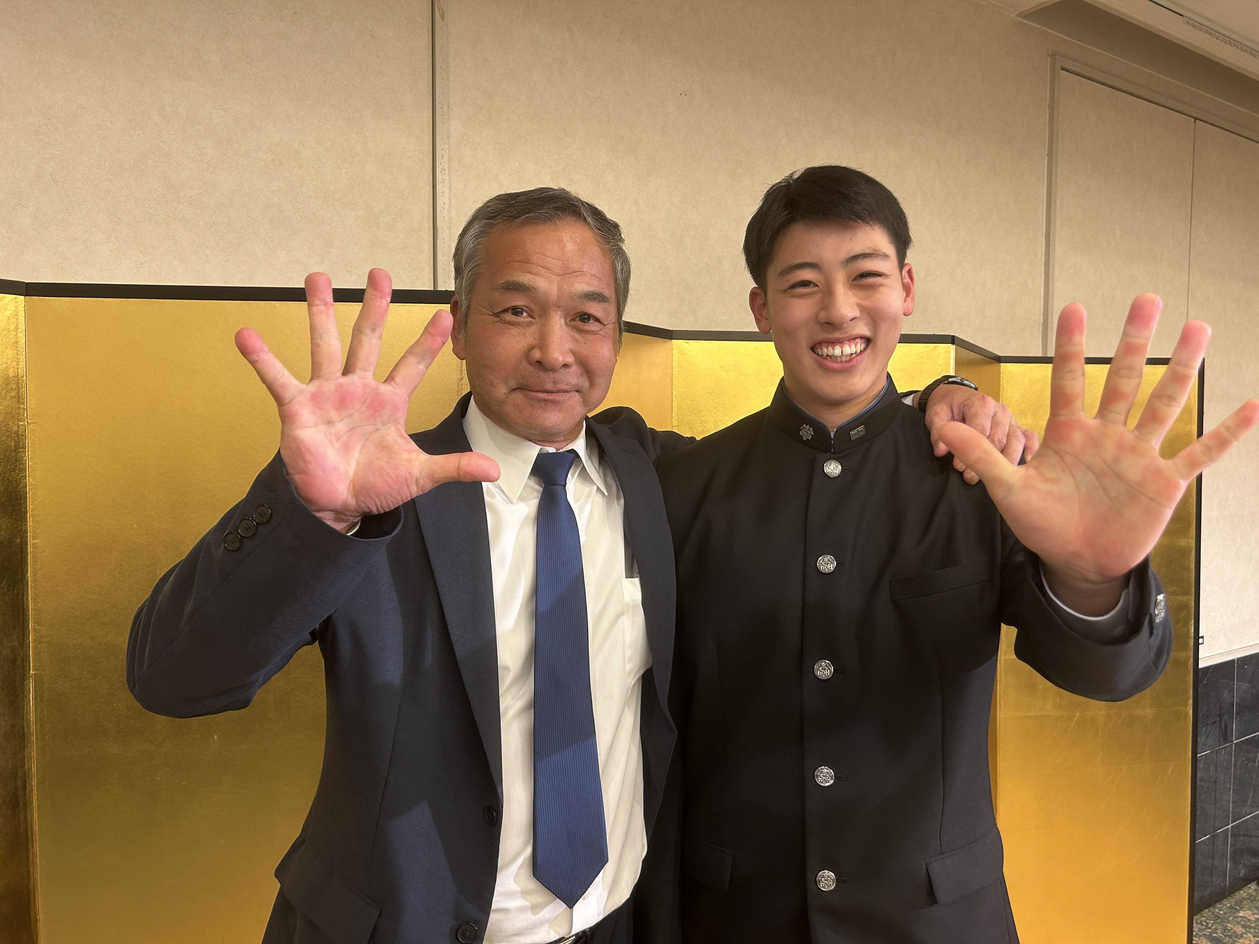 仮契約後は高橋投手と音チーフスカウトは肩を組み、両手を広げる5位ポーズ!
