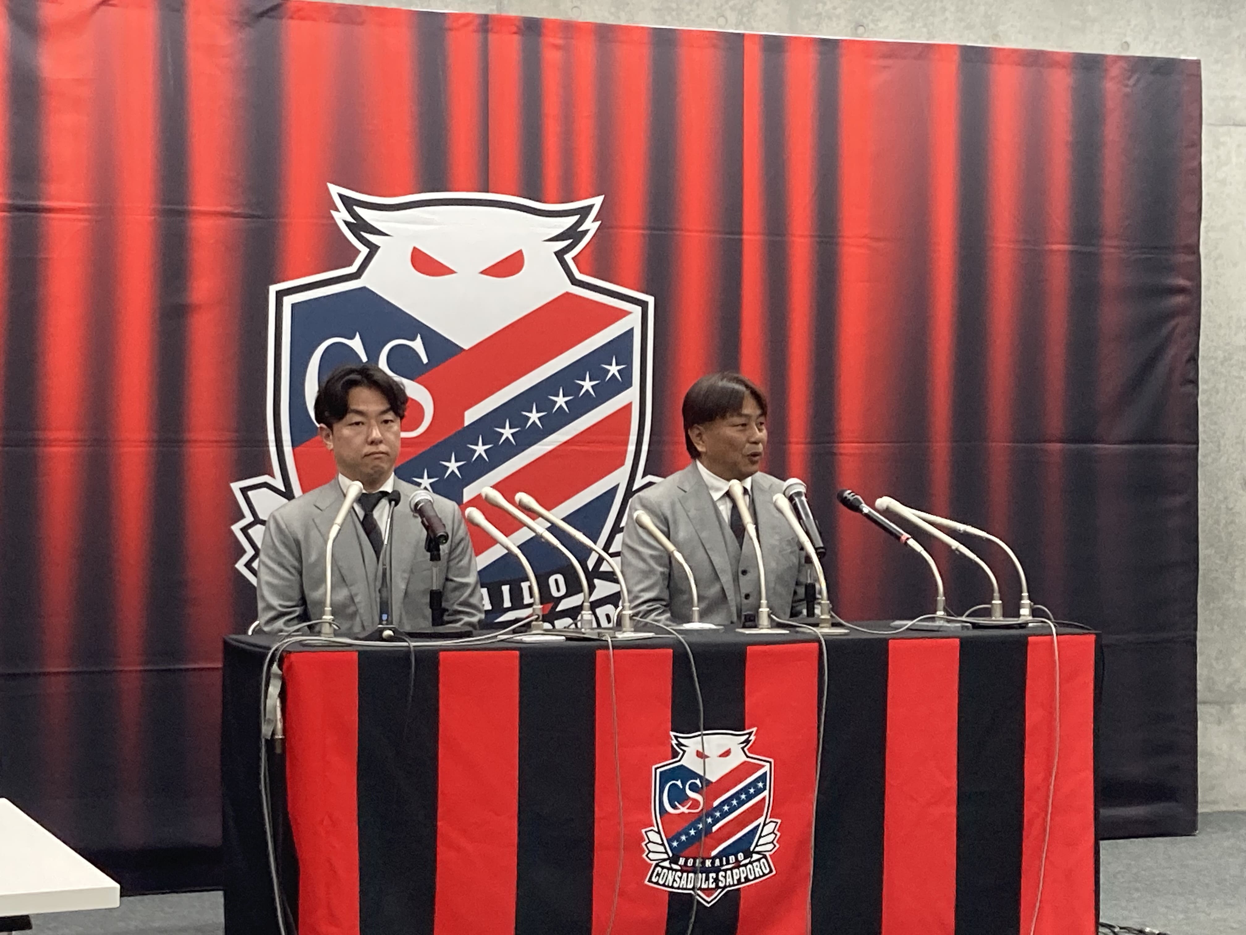 北海道コンサドーレ札幌は3月25日(火)、大和ハウスプレミストドーム(札幌市豊平区)で新経営体制会見を行い、石水創代表取締役社長(42)と三上大勝代表取締役GM(53)が出席しました。