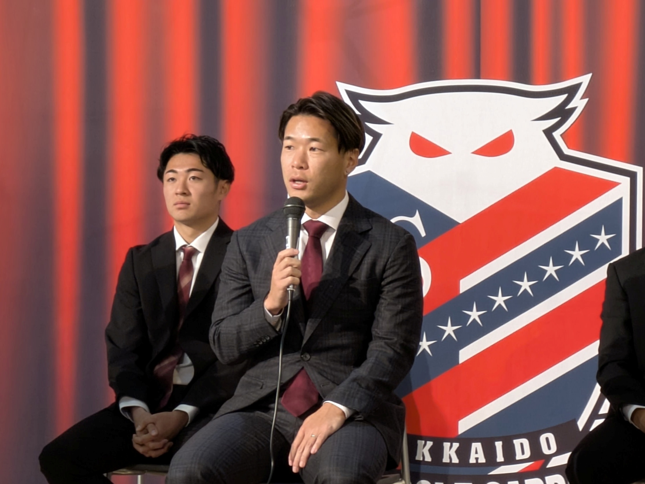 札幌出身の堀米悠斗選手は、2016年に札幌を離れ、その後アルビレックス新潟で長くプレーし、10年ぶりに札幌へ戻ってきました。会場から「おかえり!」と声をかけられると「ありがとうございます」と応じました。10年ぶりの復帰にあたり「正直、僕自身への受け止めはさまざまかと思いますが、そんな声もすべて覚悟した上で、もう一度このまちで戦うことを決心しました」と語りました。